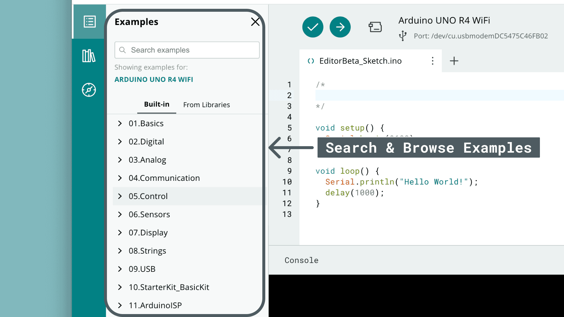 The Cloud Editor features all the necessary tools to develop and test your Arduino projects, including: